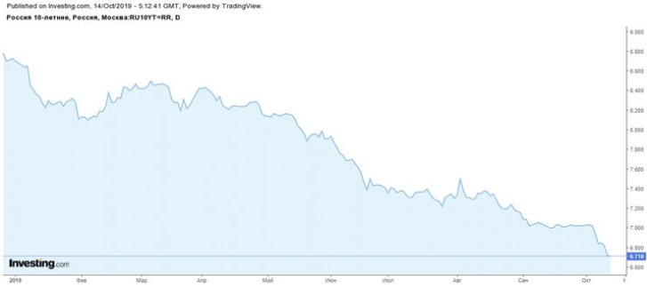 Намек председателя ЦБ РФ на вероятность более быстрого смягчения денежно-кредитной политики, чем предполагалось ранее, спровоцировал ажиотаж на рынке облигаций федерального займа, кривая доходности которых целиком оказалась ниже 7% впервые с 2013 г., отмечает Bloomberg.