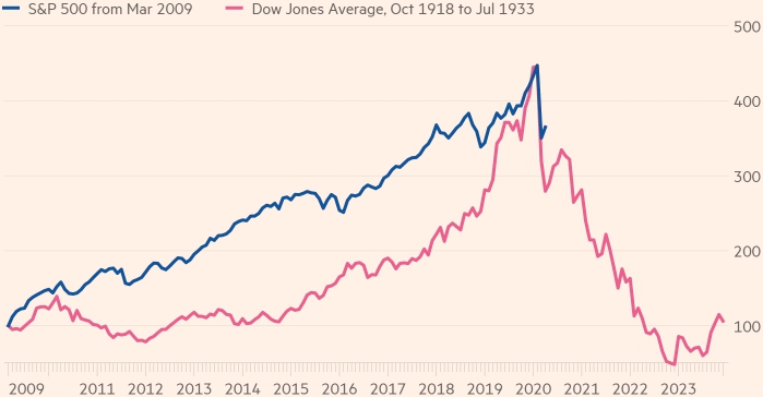 Динамика индекса Dow Jones в период с 1918 по 1932 годы крайне напоминает динамику индекса S&P 500 в период с 2009 года по нынешнее время, отмечает эксперт. Поэтому рынку акций еще только предстоит нащупать дно.