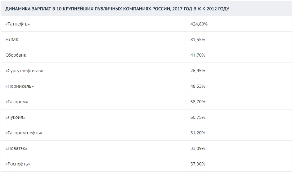 С 2012-го по 2017 год включительно средняя зарплата в России выросла примерно в полтора раза — с 26,6 до 39,14 тыс. рублей. Средние зарплаты в крупных корпорациях были и остаются гораздо выше, часто — на порядок. Тем не менее росли они с сопоставимой скоростью, а в некоторых случаях и медленнее.