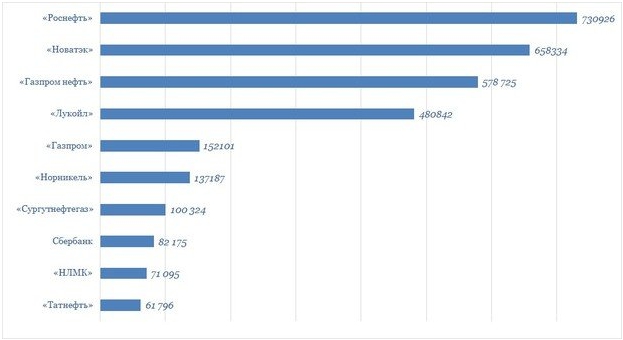 Крупнейшая публичная компания России — Сбербанк, по состоянию на 29 декабря 2017-го ее рыночная стоимость достигала 4,86 трлн рублей (без учета привилегированных акций). При этом средняя зарплата в Сбербанке растет не так быстро, как в целом по стране: в 2012—2017 годах она увеличилась на 41,7%.