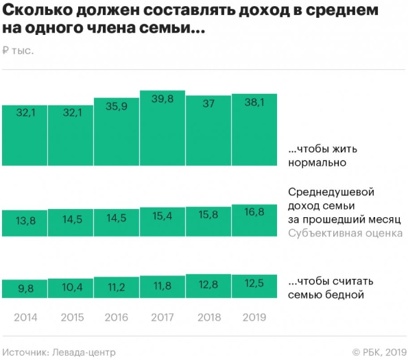 В представлении россиян семья живет в бедности, если доход одного члена семьи ниже 12,5 тыс. руб., следует из исследования Левада-центра (есть в распоряжении РБК). Субъективная граница бедности на 11,6% выше установленного властями порога бедности — прожиточного минимума, который во втором квартале 2019 года составил 11,2 тыс. руб.