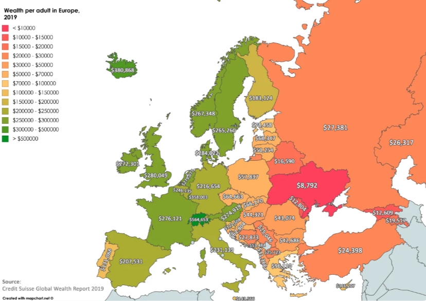 Уровень богатства взрослых людей в Европе. В РФ каждый взрослый имеет $27 381