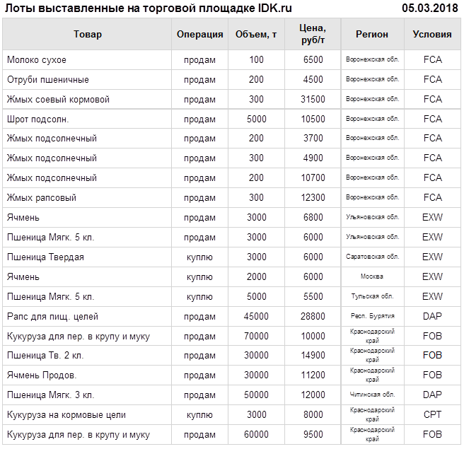 В понедельник, 05.03.2018, на торговой площадке IDK.ru был выставлен ряд лотов продукции сельского хозяйства.