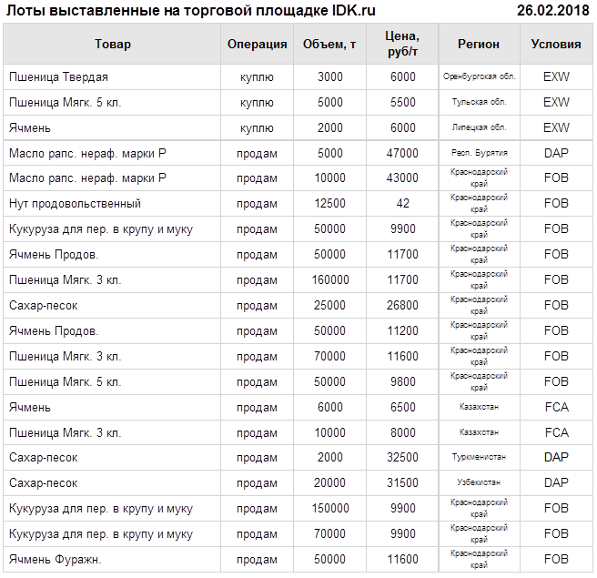 Сегодня, 26.02.2018, на торговой площадке IDK.ru был выставлен ряд лотов продукции сельского хозяйства.