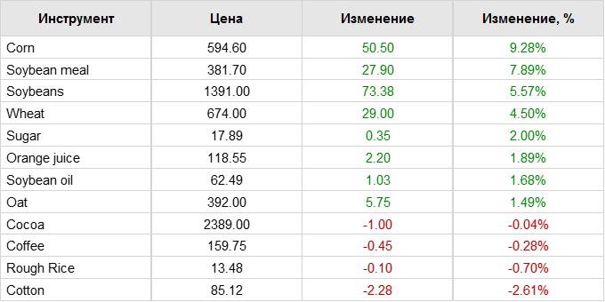 Посевные площади сои и кукурузы в США этой весной оказались меньше, чем ожидалось, сообщило в среду Министерство сельского хозяйства США, что вызвало обеспокоенность по поводу мировых запасов, поскольку другой отчет показал, что запасы США находятся на многолетних минимумах. Эти данные шокировали рынок, спровоцировав ралли фьючерсов на кукурузу и сою на Чикагской товарной бирже, которые в преддверии выхода отчетов резко упали. Более низкие, чем ожидалось, посевы в сочетании с опасениями по поводу засухи на севере США указывают на ограниченные запасы у второго в мире экспортера сои и кукурузы.