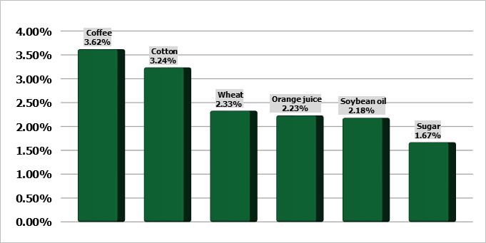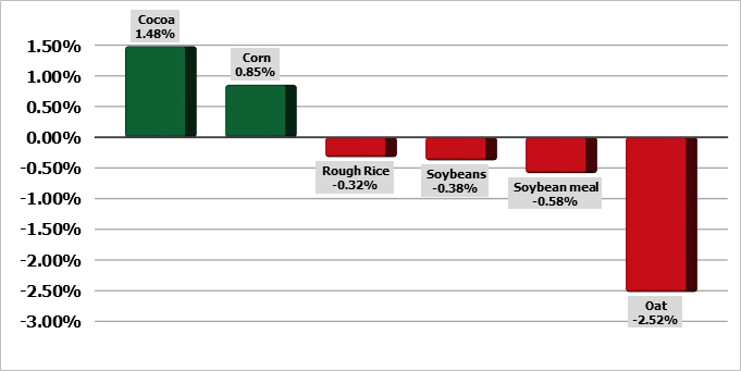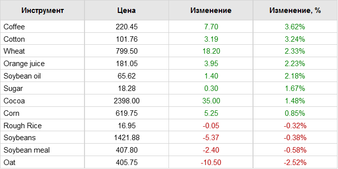 Наиболее активный контракт на кукурузу на Чикагской торговой бирже (CBOT) Cv1 вырос на четверть цента до $6,14-1/4 за бушель по состоянию на 00:28 по Гринвичу, а соевые бобы Sv1 снизились на 0,1% до $14,27-1/2 за бушель.