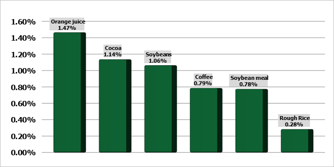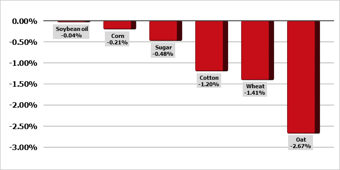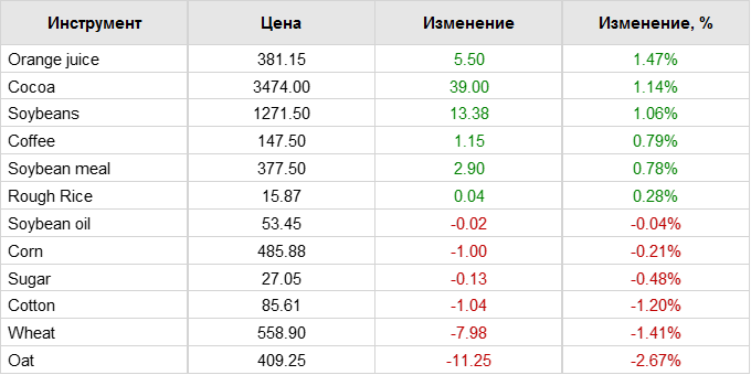 Фьючерсы на пшеницу в Чикаго упали во вторник, поскольку экспортные цены в России, ее основном поставщике, упали еще больше, хотя снижение объемов поставок из страны укрепило ожидания того, что предложение сократится в ближайшие месяцы. Цены на кукурузу и соевые бобы также упали на фоне роста предложения в результате продолжающегося сбора урожая в США и рекордных урожаев в Бразилии, крупнейшем экспортере. Наиболее активные фьючерсы на пшеницу Чикагской торговой биржи (CBOT) упали на 1,1% до $5,66-3/4 за бушель к 04:18 по Гринвичу, что близко к трехлетнему минимуму прошлого месяца в $5,40. Кукуруза CBOT упала на 0,4% до $4,86-1/2 за бушель, а соевые бобы подешевели на 0,5% до $12,57-3/4 за бушель.