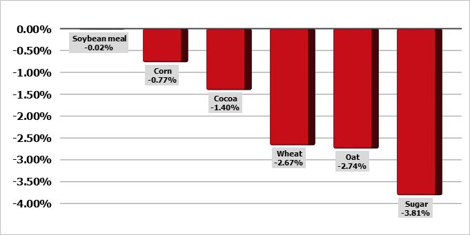 Фьючерсы на сою в США упали в пятницу после того, как обновленная оценка Министерства сельского хозяйства урожая сои в Бразилии упала до верхнего предела торговых ожиданий, что ослабило опасения по поводу мировых поставок масличных культур. Снижение фьючерсов на сою задало тон. Министерство сельского хозяйства США в ежемесячном отчете оценило производство сои в Бразилии на уровне 161 миллиона тонн, что ниже ноябрьской оценки в 163 миллиона, но это все равно самый крупный урожай за всю историю, если он будет реализован. Аналитики, опрошенные Reuters, в среднем ожидали оценку в 160,16 миллиона тонн. Соевые бобы Sv1 Чикагской торговой биржи (CBOT) подешевели на 7-3/4 цента до $13,04 за бушель, откатившись после установления недельного максимума на уровне $13,30-3/4. За неделю контракт упал на 21 цент за бушель или на 1,6%.