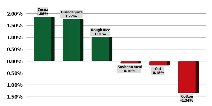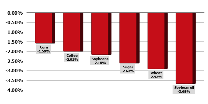 Котировки пшеницы в США за прошлую неделю продолжали снижаться, приближаясь к уровню 5 долларов за бушель. Французские пшеничные контракты шли вниз за американскими котировками. Только британская пшеница двигалась против общего течения и повысилась на пол процента. Американская кукуруза повысила позиции, а соя, наоборот снизила. За всю прошлую неделю доллар поднимался к евро только один день, все остальные дни падал в высокой траектории. К фунту доллар сначала повышался, но потом обрушился с отрицательным итоговым результатом. Европейские котировки в результате получили дополнительную стоимость в американском номинале.