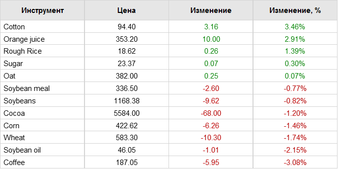 Фьючерсы на сою и кукурузу в Чикаго практически не изменились во вторник вблизи трехлетних минимумов, поскольку на рынке висели ожидания обильных поставок, а инвесторы ждали данных по инфляции в США и посевным площадям. Снижение цен на российское зерно привело к падению цен на пшеницу. Самый активный контракт на сою на CBOT снизился на 0,1% до $11,92 за бушель к 12:45 по Гринвичу, а контракт на кукурузу CBOT Cv1 вырос на 0,3% до $4,31-3/4 за бушель. Оба были близки к трехлетним минимумам, достигнутым на прошлой неделе. Пшеница CBOT Wv1 упала на 0,4% до $5,95-1/4 за бушель.