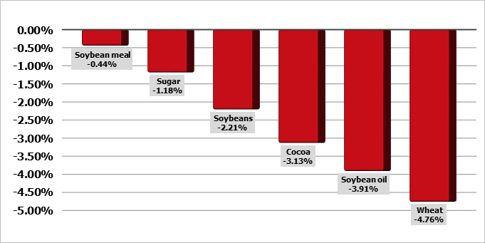 Фьючерсы на пшеницу в Чикаго еще больше подешевели в понедельник, цены упали до самого низкого уровня за последние три месяца, поскольку давление со стороны свежесобранных зерновых в Соединенных Штатах и России привело к падению рынка.