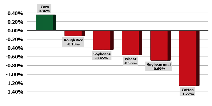 Фьючерсы на пшеницу упали в среду утром на целых 12 1/2 цента по всем сортам внутри страны. Фьючерсы на CBT SRW оставались в плюсе к закрытию вторника, но потеряли 13 центов по сравнению со своими внутридневными максимумами. Цены на KC HRW и MGE HRS резко упали во второй половине дня. Фьючерсы KC за первый месяц упали на 2–4 3/4 цента за день.