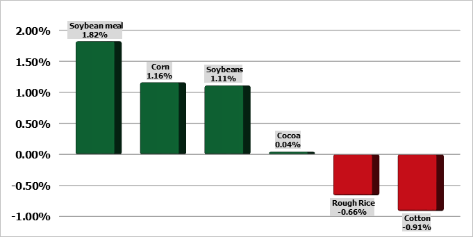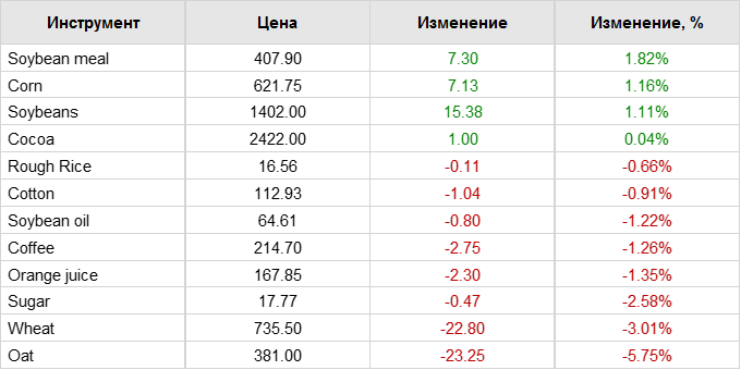 Утром 18 августа сентябрьские фьючерсы на кукурузу подешевели на 4 цента, а декабрьские — на 5 центов. Сентябрьские соевые бобы подешевели на 1 цент, а ноябрьские — на 5 центов. Фьючерсы на пшеницу продолжают снижаться. Пшеница CBOT подешевела на 25 центов. Пшеница KC подешевела на 26 центов. Пшеница из Миннеаполиса подешевела на 22 цента.