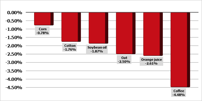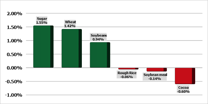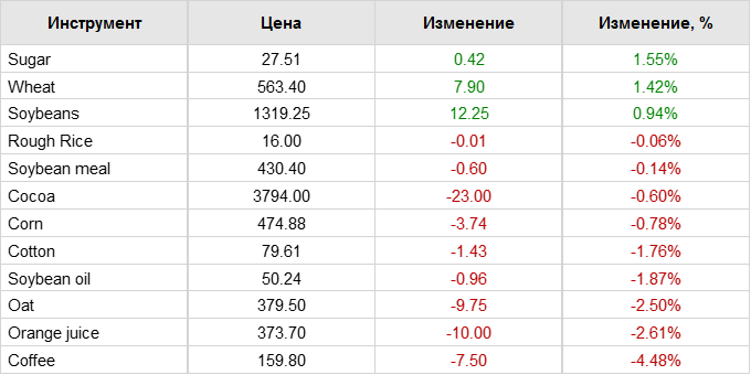 Цены на пшеницу в Чикаго упали в среду и достигли трехнедельного минимума вторника на фоне крупных поставок из России, вялого спроса и меньшей обеспокоенности по поводу небольших урожаев в странах-экспортерах южного полушария. Цены на соевые бобы также снизились, в то время как цены на кукурузу выросли. Наиболее активные фьючерсы на пшеницу на Чикагской торговой палате (CBOT) упали на 0,2% до $5,55 за бушель к 04:18 по Гринвичу, что стало их четвертым дневным падением подряд. Наиболее активные фьючерсы на пшеницу на Чикагской торговой палате (CBOT) упали на 0,2% до $5,55 за бушель к 04:18 по Гринвичу, что стало их четвертым дневным падением подряд.