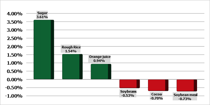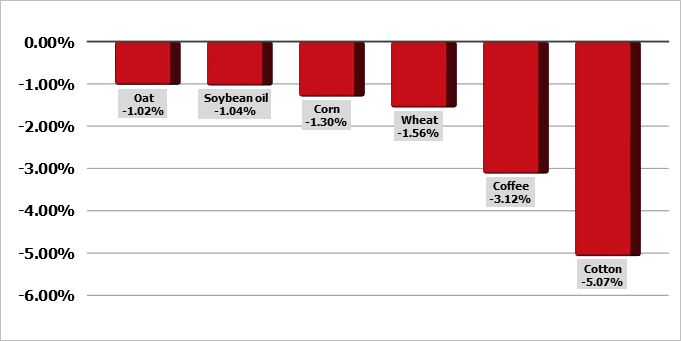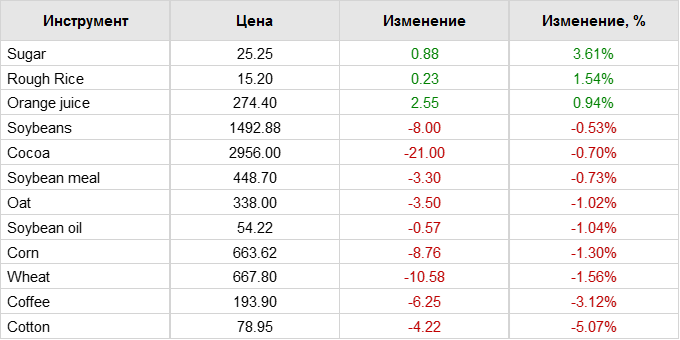 Июльская кукуруза в конце четверга подешевела на 10 центов. Июльские соевые бобы подешевели на 11 центов. Пшеница CBOT упала на 12 центов. KC пшеница упала на 23 цента. Пшеница из Миннеаполиса подешевела на 12 центов. В полдень The Brock Report сообщил, что давление на фьючерсы на зерновые и масличные культуры «исходит из-за плохих еженедельных экспортных продаж по всем направлениям, огромного урожая в Бразилии, в основном благоприятных прогнозов посевов на Среднем Западе и более слабой сырой нефти». Фьючерсы на S&P 500 упали на 26 пунктов. Фьючерсы на Dow упали на 140 пунктов.