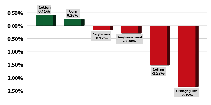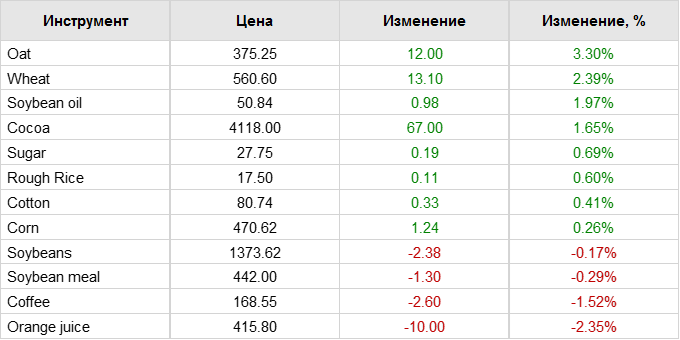 На фоне жары и дождей в выходные в Бразилии и результатов президентских выборов в Аргентине фьючерсы на американскую сою выросли в понедельник на 2%. Погодные условия в Бразилии и подтвержденные экспортные продажи в Мексику привели к росту фьючерсов на кукурузу. Ожидания, что Министерство сельского хозяйства США оставит без изменений свои еженедельные оценки состояния озимой пшеницы в США, которые показали лучший старт за последние годы, оказали давление на фьючерсы на пшеницу в понедельник, отправив фьючерсы на биржах Чикаго и Канзас-Сити к контрактным минимумам. После закрытия Министерство сельского хозяйства США сообщило, что озимая пшеница с оценкой от хорошей до отличной выросла на один процентный пункт по сравнению с неделей ранее. Декабрьские фьючерсы на кукурузу прибавили 2½ цента и закрылись на уровне 4,69½ доллара за унцию. Декабрьская пшеница в Чикаго подешевела на 7½ центов и закрылась на уровне 5,43½ доллара за штуку.