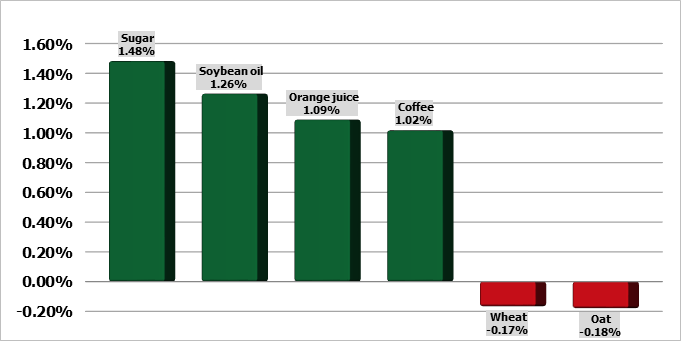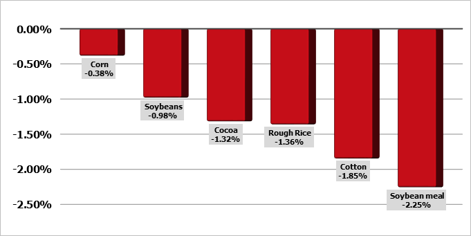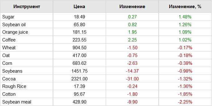Фьючерсы на сою выросли, а на кукурузу в ходе ночных торгов мало что изменилось, так как в ближайшие несколько дней в некоторых частях Среднего Запада США ожидается сухая погода, хотя отсутствие дождя в этот момент может не оказать большого влияния на урожай. «Только незначительное облегчение (ожидается) для самых засушливых 35% кукурузы и сои (в основном на западе Среднего Запада), но последствия быстро уменьшаются по мере созревания урожая», — говорится в отчете Commodity Weather Group. По состоянию на воскресенье в США было собрано три процента соевых бобов, в то время как 42 процента урожая опадали, сообщило на этой неделе Министерство сельского хозяйства.