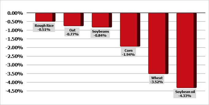 Соевые бобы в понедельник показали потери в размере двузначных цифр от 10 до 15 центов, поскольку рынок бобового масла сталкивается с давлением сырой нефти. Фьючерсы на соевый шрот упали на 2 доллара за тонну. Соевое масло торгуется с дневными потерями в 123 пункта. Сырая нефть упала на 2,75 доллара, поскольку рынок не видит реакции после ударов США по ядерным объектам Ирана в выходные. Ожидается, что данные Crop Progress покажут, что урожай сои в США засеян на 97%, при этом трейдеры ожидают, что 67% урожая будут оценены как хорошие/отличные, что на 66% больше, чем в прошлом году.