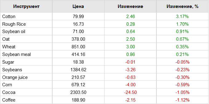 Фьючерсы на сою в США выросли в четверг на 1,4%, так как сильные данные по экспорту поддержали надежды на то, что зарубежные покупатели заключат больше сделок в ближайшие недели. Министерство сельского хозяйства США сообщило в четверг, что экспортные продажи сои составили 2,336 млн тонн за неделю, закончившуюся 13 октября, что является самым большим недельным объемом за год. Кроме того, Министерство сельского хозяйства США сообщило, что частные экспортеры сообщили о продаже 201 000 тонн соевых бобов в Китай и 132 000 тонн сои в неизвестных направлениях. Ноябрьские фьючерсы на сою на Чикагской товарной бирже подорожали на 19 центов по цене 13,91-1/2 доллара за бушель.