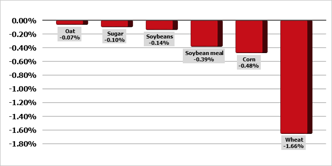 Фьючерсы на сою упали на 15 центов до 14,91 ½ доллара за бушель на Чикагской товарной бирже. Соевый шрот подешевел на 7,80 доллара до 455,90 доллара за короткую тонну, в то время как соевое масло потеряло 0,12 цента до 61,85 доллара за фунт.
