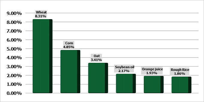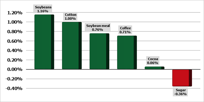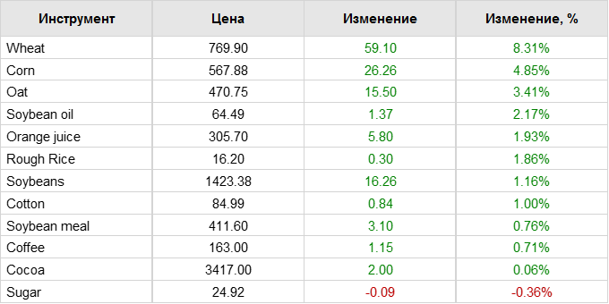 Соевые бобы начали неделю с двузначным приростом. Шрот также подорожал на 4-5 долларов, при этом соевое масло выросло на 2 цента. Ближайшие фьючерсы на сою в пятницу закрылись ростом от 3 ¾ до 6 центов за бушель. Контракты на новый урожай были в основном на один пенни или 3 цента ниже, ноябрь завершил неделю с чистым приростом в 31 цент, удерживаясь выше отметки в 14 долларов впервые в этом календарном году. Предварительный открытый интерес показал небольшие чистые продажи, до 4970 контрактов в пятницу. Фьючерсы на соевый шрот закрылись в основном ростом, подорожав в пятницу на 0,70–2,30 доллара. Октябрьский контракт был на $1,50 за тонну ниже в течение дня.