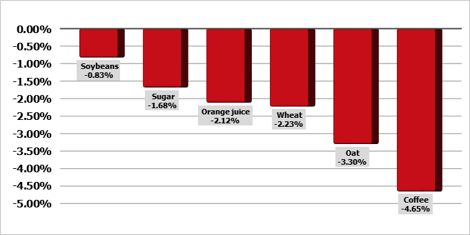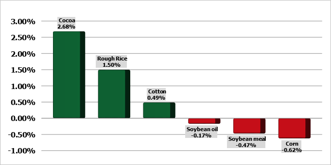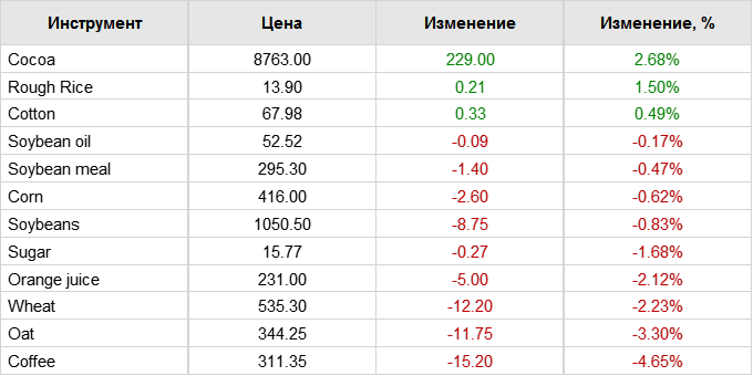 Соевые бобы падали еще на 4–6 ½ центов во вторник. Фьючерсы упали на 9–15 центов по большинству контрактов в понедельник, поскольку рынок бобового масла столкнулся с давлением сырой нефти. Фьючерсы на соевый шрот упали на 1,50–1,80 долл./тонну. Соевое масло торгуется с дневными потерями в 135 пунктов. Еженедельный отчет USDA о ходе посева показал, что посадка сои в США продвинулась всего на 3% за неделю, закончившуюся в воскресенье, до 96%, что ниже среднего пятилетнего показателя в 97%. Всхожесть составила 90%, что соответствует среднему темпу, с 8% цветущими, что выше обычного показателя в 7%.