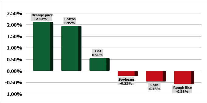 Фьючерсы на пшеницу в Чикаго выросли во вторник, поскольку низкая оценка урожая для крупнейшего экспортера России и признак того, что Индия может вскоре начать импорт зерна, помогли поднять цены с двухмесячных минимумов. Фьючерсы на сою и кукурузу упали, поскольку инвесторы взвесили влияние жары, а затем наводнений на посевы в Соединенных Штатах. Самый активный контракт на пшеницу на Чикагской торговой бирже (CBOT) Wv1 вырос на 0,2% до $5,72 за бушель к 04:51 по Гринвичу после падения до $5,64 в понедельник, самого низкого уровня с 19 апреля. Пшеница выросла до 10-месячного максимума 7,20 доллара в прошлом месяце после того, как неблагоприятная погода в России привела к резкому сокращению оценок урожая в стране, но этот рост цен почти полностью свелся на нет. Что касается других культур, сентябрьская кукуруза CBOT CU24 снизилась на 0,4% до $4,37-1/2 за бушель, а соевые бобы Sv1 снизились на 0,2% до $11,28 за бушель.