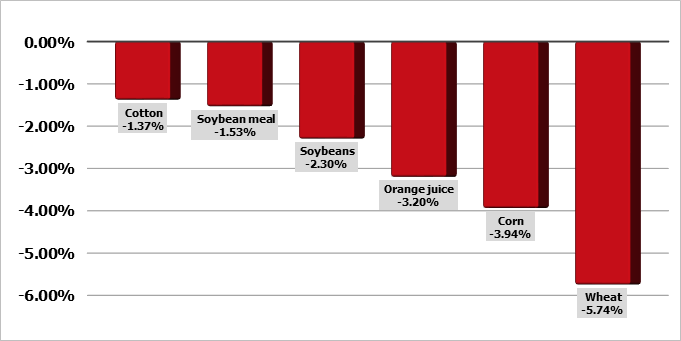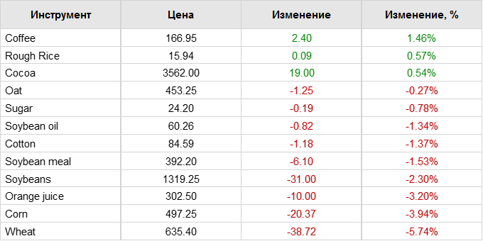 Рынок пшеницы в Чикаго завершил сессию вторника на десять центов ниже своих минимумов, но все еще слабее на 8 3/4–13 1/2 цента. Предварительный открытый интерес показывает чистые новые продажи, увеличившись на 7 287 контрактов за день. Сентябрьские контракты в течение дня показали широкий диапазон 31 3/4 цента. Фьючерсы на KC упали на 5 1/2 до 11 3/4 цента при закрытии, но держались выше отметки в 8 долларов. Еженедельное обновление Министерства сельского хозяйства США показало, что сбор урожая озимой пшеницы увеличился на 12% до 80%. Что касается яровой пшеницы, Министерство сельского хозяйства США сообщило, что сбор урожая начался на прошлой неделе, и по стране на 30 июля сбор урожая был завершен на 2%.