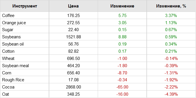 Зерновые и соевые бобы выросли в цене после пятничных квартальных отчетов Министерства сельского хозяйства США о запасах и посевных площадях. Запасы сои в начале марта составили 1,69 млрд бушелей по сравнению с 1,93 млрд годом ранее и прогнозами аналитиков на уровне 1,74 млрд бушелей. Агентство сообщило, что посевы сои составляют 87,5 млн акров, что немного больше, чем в прошлом году, но не соответствует ожиданиям в отношении 88,2 млн акров. Фьючерсы на сою с поставкой в мае выросли на 10 центов до 15,15 доллара за бушель. Соевый шрот не изменился и составил 466 долларов за короткую тонну, а соевое масло прибавило 1,11 цента до 56,6 цента за фунт.