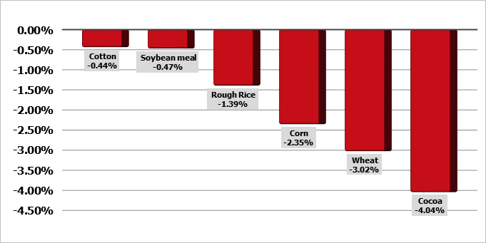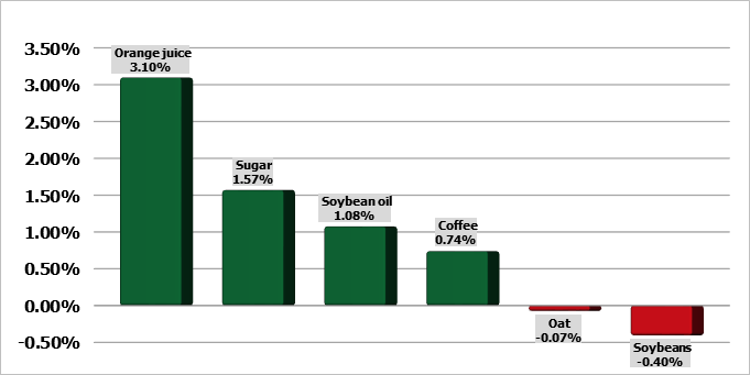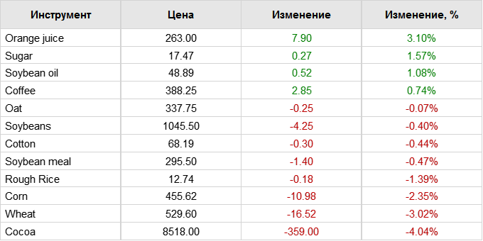 Соевые бобы в понедельник торговались с потерями от 9 до 12 центов по большинству контрактов в полдень. Фьючерсы на соевую муку снижались на $1,30 за тонну, а фьючерсы на соевое масло падали на 74 пункта. Данные по экспорту показали, что за неделю до 1 мая было отгружено 324 101 млн тонн соевых бобов. Это на 29,2% меньше, чем на предыдущей неделе, и на 9,5% меньше, чем на той же неделе прошлого года. Крупнейшим пунктом назначения стала Мексика — 81 888 млн тонн, 68 099 млн тонн отправились в Китай и 58 091 млн тонн — в Японию. С 1 сентября объем экспорта составил 43,46 млн тонн, что на 11,2% выше, чем за аналогичный период прошлого года.