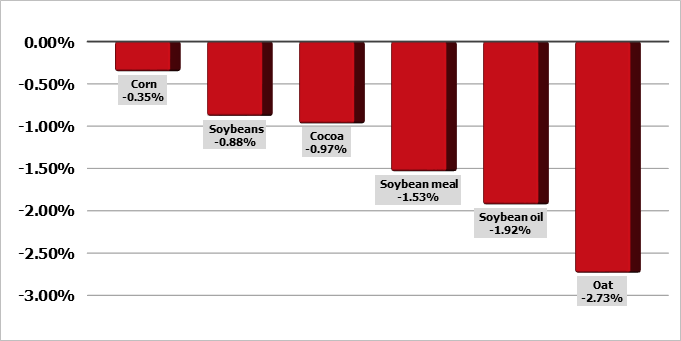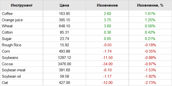 Фьючерсы на сою Чикагской товарной биржи упали на 2,5% в понедельник, поскольку дождливая погода на большей части основных сельскохозяйственных угодий в США и прогнозы хороших условий выращивания на август привели к снижению цен до самого низкого уровня более чем за пять недель. В 10:33 по центральному поясному времени (15:33 по Гринвичу) ноябрьские фьючерсы на сою на CBOT упали на 37-1/4 цента по 12,96 доллара за бушель. Цены достигли дна на уровне 12,91 доллара, что является самым низким показателем для самого активного контракта с 30 июня.