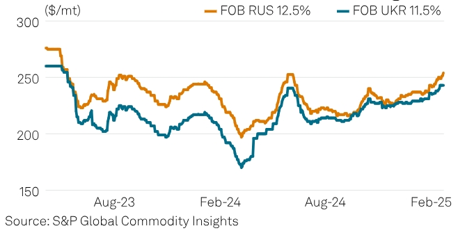 Цена на российскую пшеницу с содержанием протеина 12,5% на условиях FOB, по оценке Platts, выросла до самого высокого уровня с мая 2023 года, достигнув 254 долл. США за тонну 25 февраля на фоне ограниченного предложения и медленного экспорта. В последний раз такая высокая цена была в мае 2023 года, когда российские трейдеры удерживали цену ниже неофициального минимального уровня в 275 долларов за тонну, чтобы привлечь покупателей и распродать старый урожай перед началом нового сезона в июле.