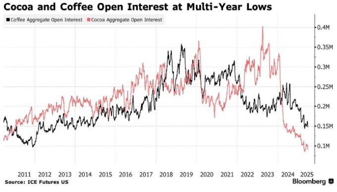 Совокупный открытый интерес к фьючерсам на какао, торгуемым в Нью-Йорке, в настоящее время находится на самом низком уровне с 2004 года, в то время как активность торговли кофе находится на самом низком уровне за десятилетие.