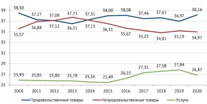 По итогам 2020 года россияне отдали 38,16% потраченных денег на продукты питания, подсчитали эксперты РАНХиГС.