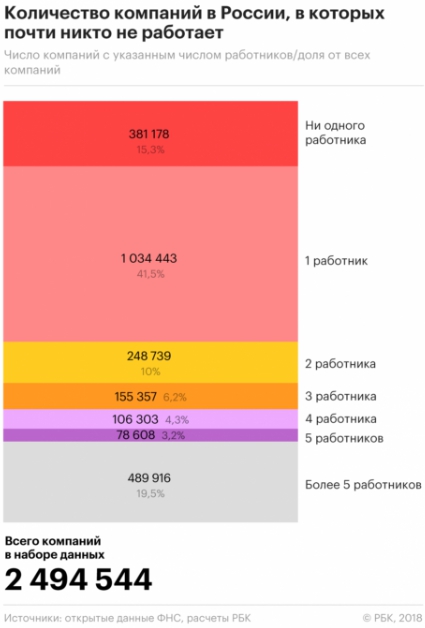 Опубликованные Федеральной налоговой службой (ФНС) открытые данные дают представление о том, сколько в России «пустых» компаний — предприятий, где никто не работает. Из статистики ФНС, которую проанализировал РБК, следует, что в 15,3% компаний, данные которых раскрыты ФНС, официально не трудоустроен ни один сотрудник. Всего в наборе 2,5 млн компаний, из них сотрудников нет в 381 тыс. организаций.