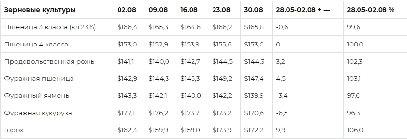 С 2 по 30 августа в американском эквиваленте пшеница 3 класса снизилась на 0,6 доллара за тонну, на 0,4%, пшеница 4 класса сохранила прежние позиции, фуражная пшеница поднялась на 4,5 доллара за тонну, на 3,1%. Продовольственная рожь повысилась на 3,2 доллара за тонну, на 2,3%, ячмень снизился на 3,4 доллара за тонну, на 2,4%, а кукуруза на 6,5 доллара за тонну, на 3,7%. Горох поднялся на 9,9 доллара за тонну или на 6%.