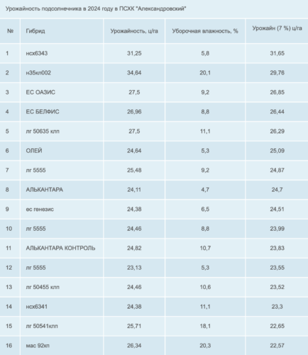 Таблица 1. Урожайность подсолнечника в 2024 году