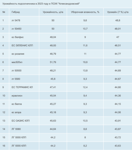 Таблица 2. Урожайность подсолнечника в 2023 году
