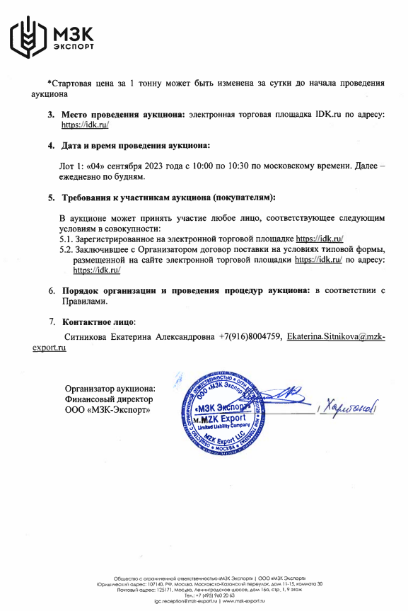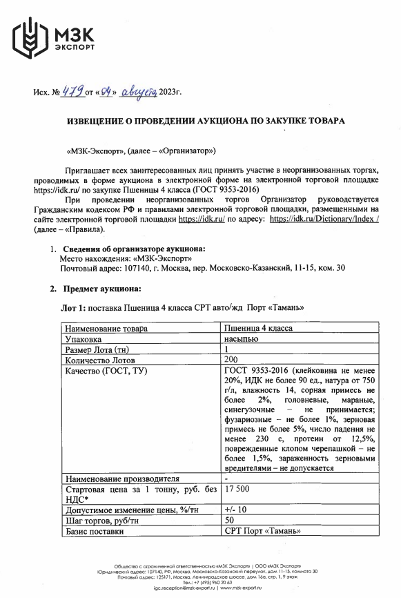 ООО «МЗК Экспорт» приглашает всех заинтересованных лиц принять участие в неорганизованных торгах, проводимых в форме аукциона в электронной форме на электронной торговой площадке https://idk.ru/ по закупке Пшеницы 4 класса (ГОСТ 9353-2016).