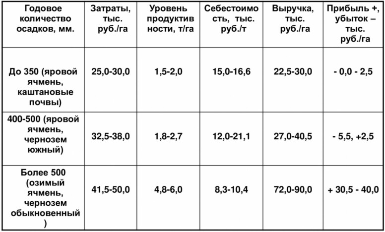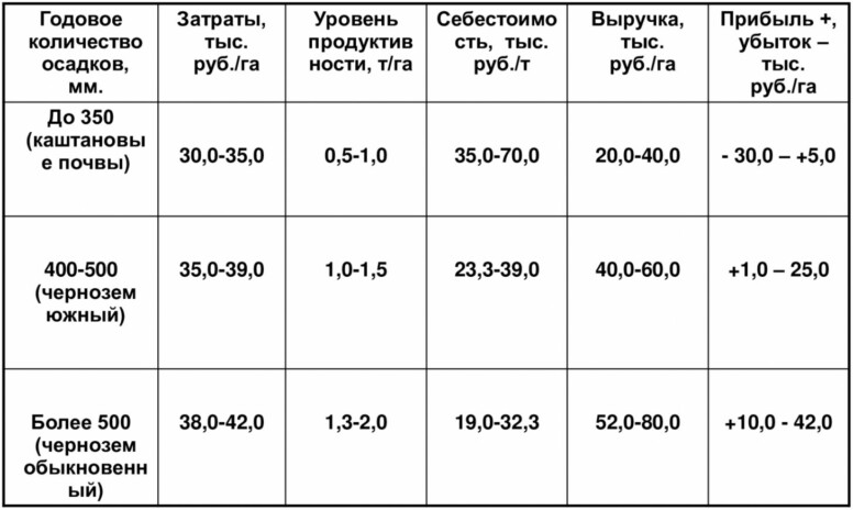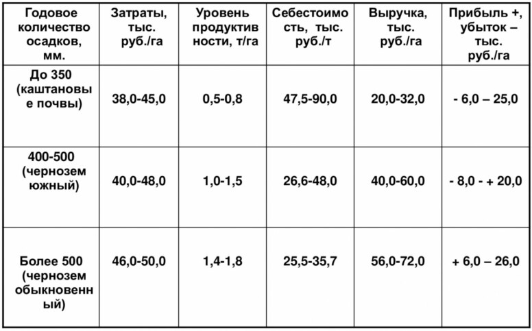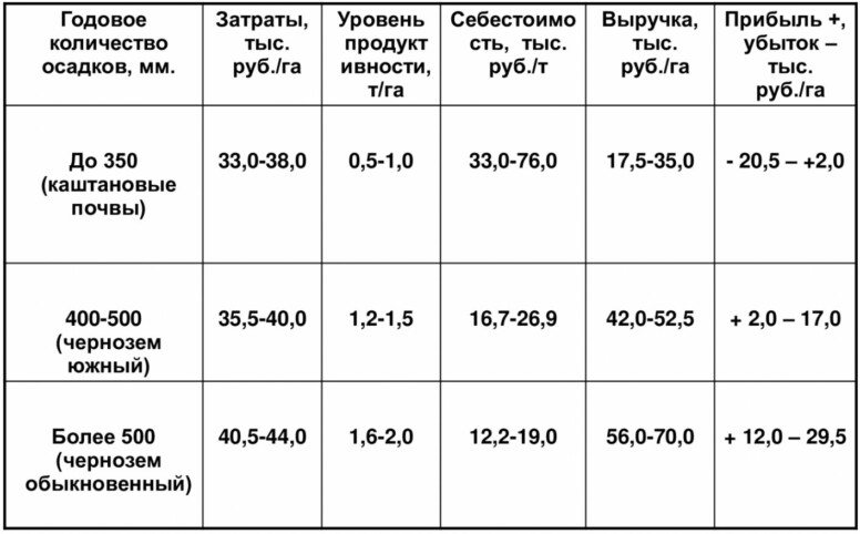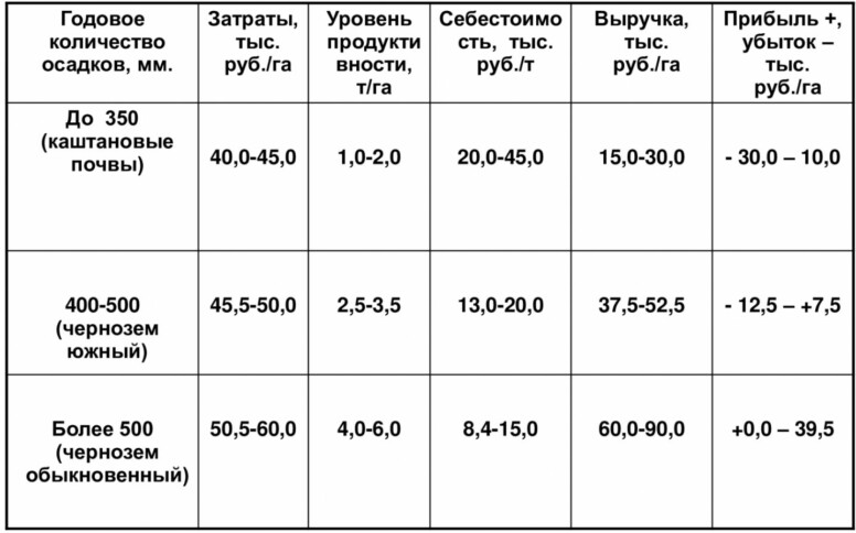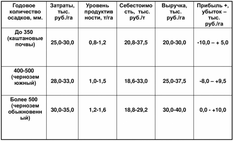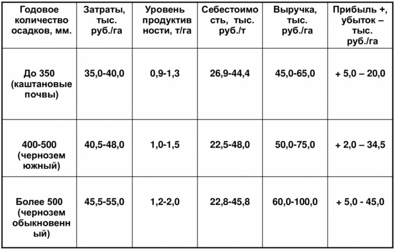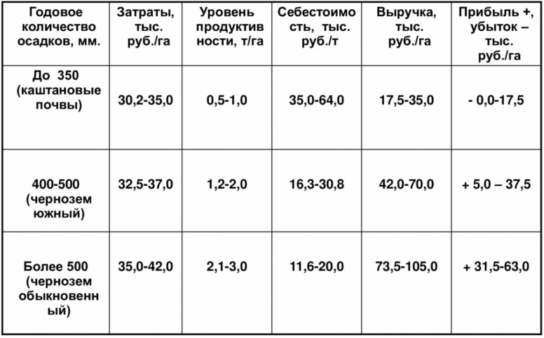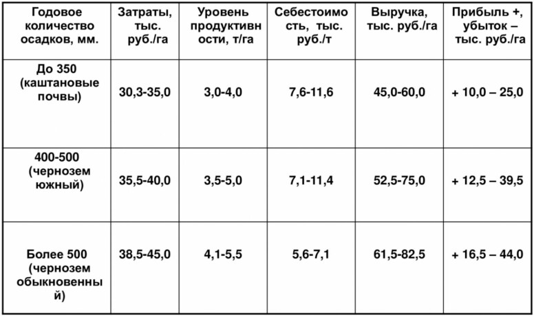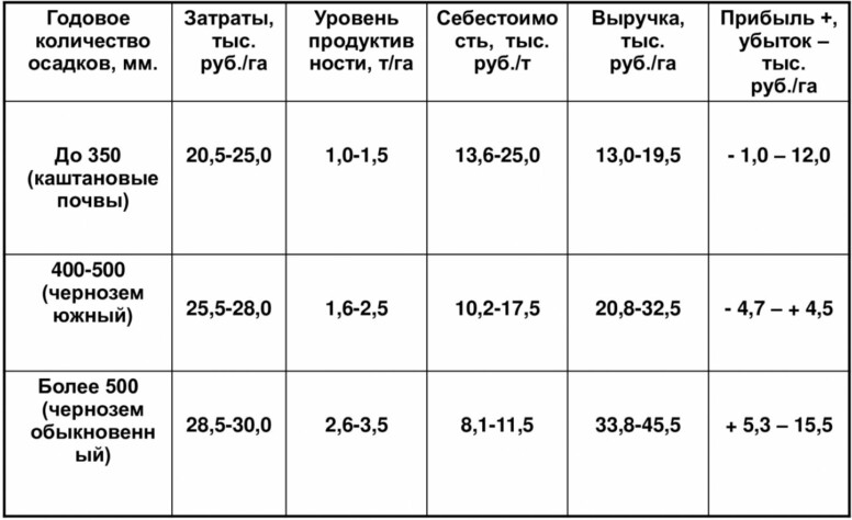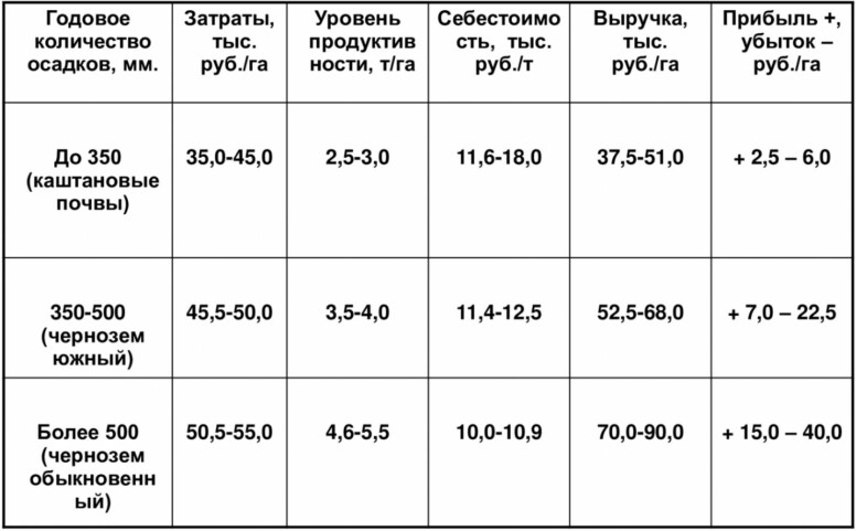- на черноземе южном при осадках 400-500 мм в год наиболее рентабельными станут озимая пшеница, нут, подсолнечник, сорго, горох, чечевица;