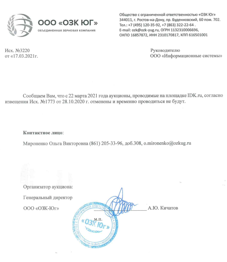 ООО «ОЗК-ЮГ» сообщает, что с 22 марта 2021-го года аукционы, проводимые на площадке IDK.ru, согласно извещения Исх. №1773 от 28.10.2020 отменены и временно проводиться не будут.