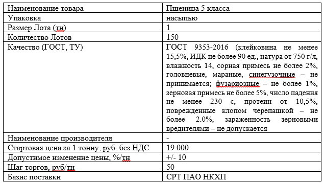 Лот 2: поставка Пшеница 5 класса СРТ авто/жд ПАО НКХП