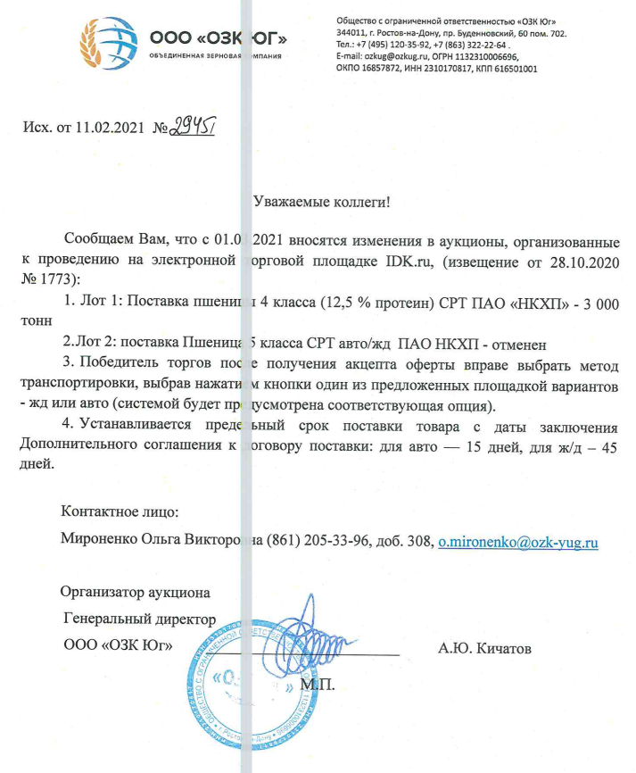 С 01.03.2021 вносятся изменения в аукционы ООО «ОЗК Юг» организованные на площадке IDK.ru (извещение №1773 от 28.10.2020).