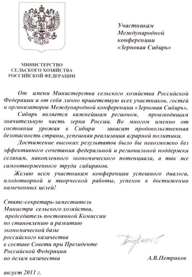 От имени Министерства сельского хозяйства Российской Федерации и от себя лично приветствую всех участников, гостей и организаторов Международной конференции «Зерновая Сибирь».