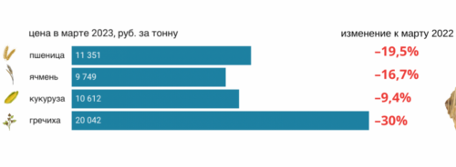 По сравнению с прошлым годом серьёзно уменьшились цены на ячмень. Его средняя цена в марте составляла 9 749 рублей, что на 16,7% ниже, чем в марте прошлого года. Кукуруза подешевела на 9,4%, в марте тонна этого вида зерна стоила 10 612 рублей. Тонна гречихи приносит сельхозпроизводителям свыше 20 тыс. рублей, но это на 30% меньше, чем в марте прошлого года.