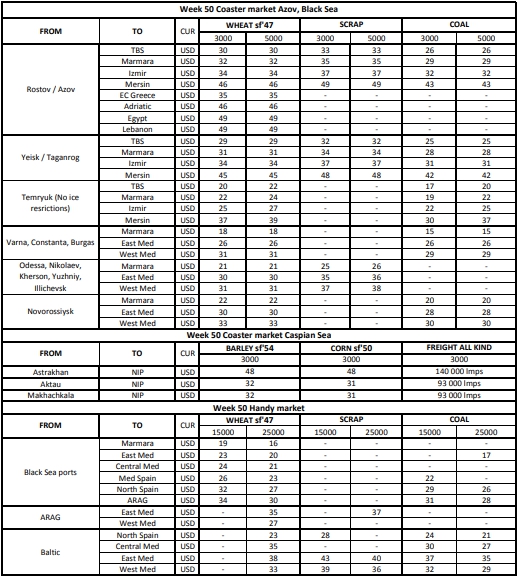 По слухам, введение ледовых ограничений в Ростове/Азове ожидается в 20-ых числах декабря, что позволяет флоту без ледового класса продолжать грузиться из Азовских портов. При этом для них сохраняется риск, в случае задержек или резкого ухудшения погоды, застрять в порту на время ледовой кампании, что отбивает желание у некоторых Судовладельцев работать из Азова. Они уже делают скидки для Фрахтователей, предлагающих груз из Черного моря или Темрюка.