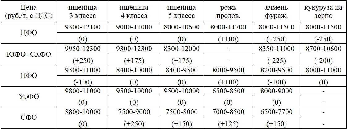 На текущей неделе отмечалось разнонаправленное движение цен на зерно в зависимости от региона. Так, в ЦФО продовольственная рожь подорожала на 100 руб./т, фуражный ячмень – на 250 руб./т, а кукуруза на зерно, наоборот, подешевела на 250 руб./т.