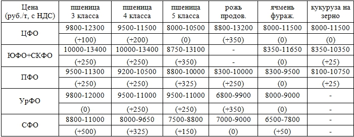 В азиатской части страны на фоне активного спроса со стороны перерабатывающих предприятий наблюдались следующие изменения ценовых котировок: на Урале стоимость пшеницы 4-го и 5- го классов увеличилась на 250 руб./т, продовольственной ржи – на 350 руб./т.; в Сибири пшеница 3-го класса прибавила в цене 500 руб./т, пшеница 4-го класса – 325 руб./т, пшеница 5-го класса – 150 руб./т, фуражный ячмень – 50 руб./т.