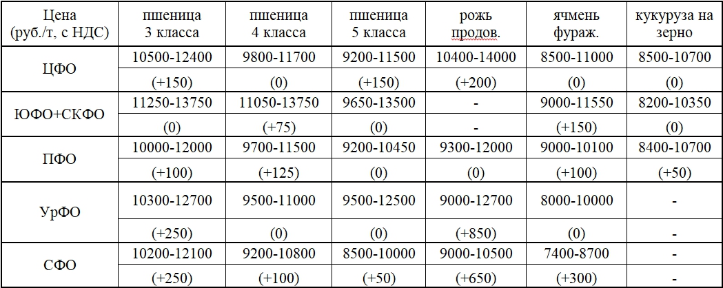 Так, в ЦФО пшеница 3-го и 5-го классов подорожала в среднем на 150 руб./т, продовольственная рожь – на 200 руб./т. Стоимость остальных зерновых культур осталась на уровне прошлой недели.