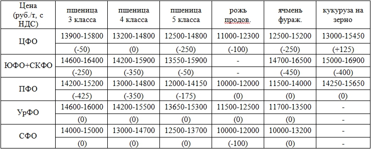 В южных регионах снижение стоимости на пшеницу 3-го класса составило 250 руб./т, пшеницу 4-го класса – 350 руб./т, пшеницу 5-го класса – 50 руб./т, фуражный ячмень – 450 руб./т, кукурузу на зерно – 400 руб./т.